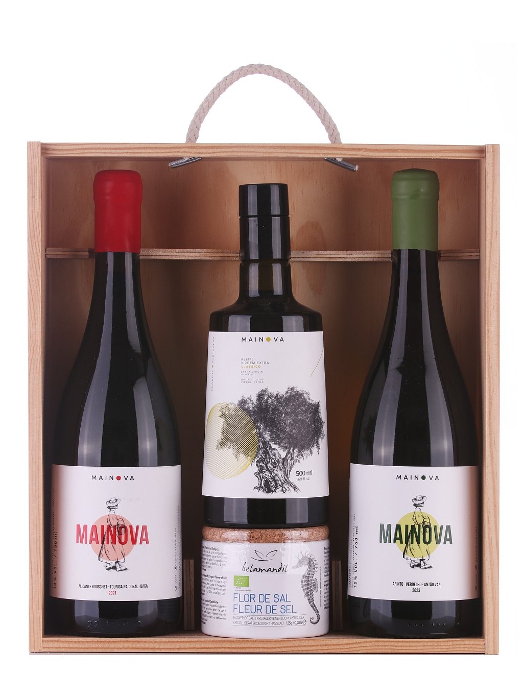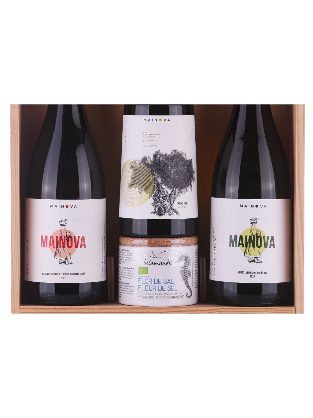 V dárkovém dřevěném boxu najdete dvě vína z vinařství Mainova. Obě vína jsou suchá a vyrábí se v horkém regionu Alentejo pod dohledem nadaného vinaře Antónia Macanity. Box neobsahuje jen vína, ale najdete v něm i olivový olej Mainova. Jak je pro olivové oleje z Alenteja typické, tak i tento olej je úžasně ovocný a jemný. Snadno v něm rozpoznáte tóny zelených listů, mírnou hořkost čerstvých mandlí a úžasnou vůni čerstvě vymačkaných oliv. Je ideální do salátů nebo třeba jen s čerstvou bagetou. Dále box obsahuje sůl tzv. solný květ. Tato sůl je považována za královnu solí a používá se k finálnímu dosolení pokrmů. Sbírá se na solných polích na jihu Portugalska v regionu Algarve.