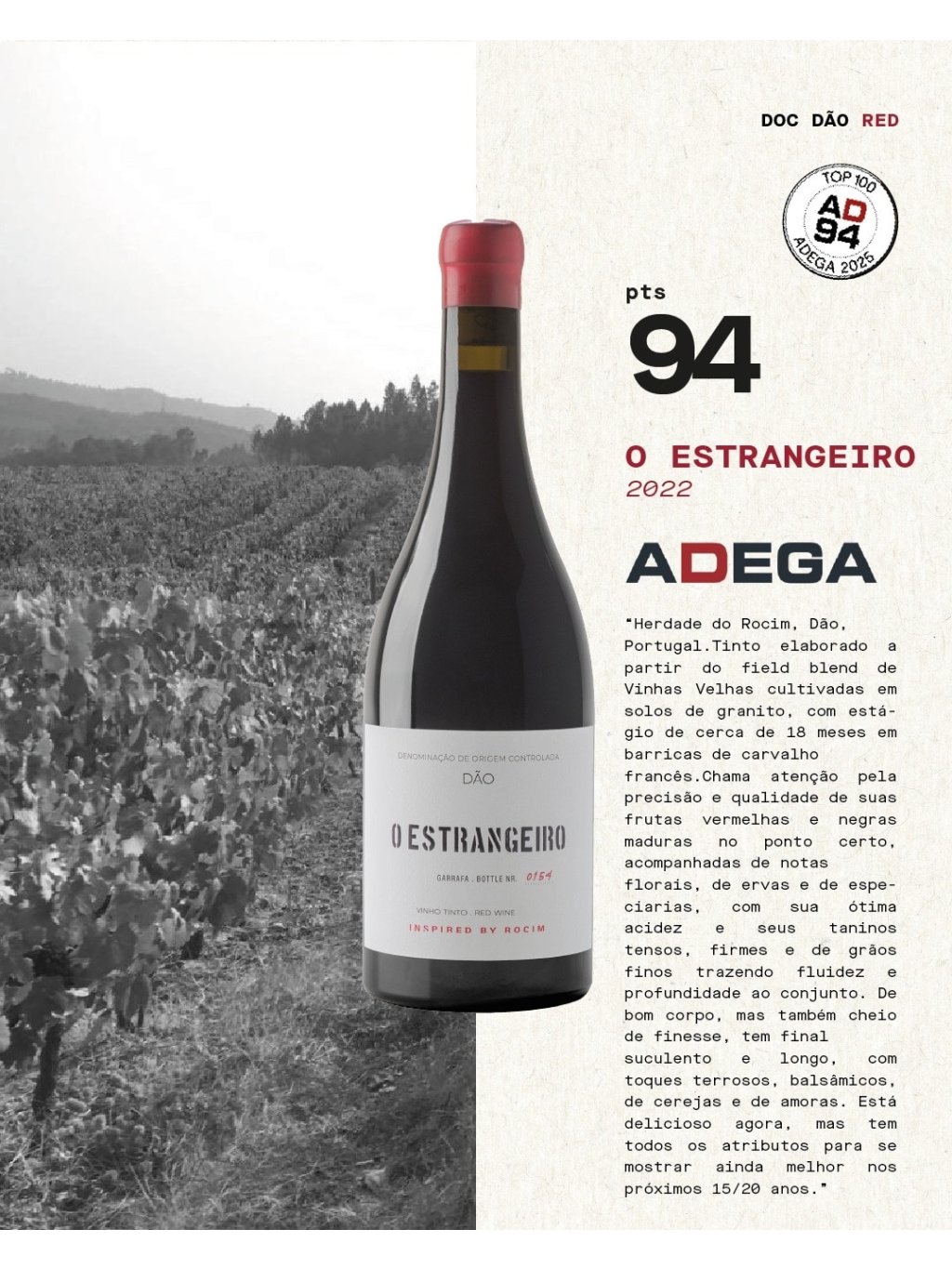 Během mojí návštěvy ve vinařství v roce 2024 mě opravdu hodně zaujalo z jejich nových projektů víno z regionu Dão. Nese název O Estranheiro, což v překladu znamená cizinec. Pravděpodobně to má symbolizovat to, že pro Rocim byl region Dão v porovnání s Alentejem velmi odlišný. A proto se tu v počátku cítili jako cizinci. Nicméně i přes zcela odlišné podmínky se jim podařilo vyrobit fantastické víno.